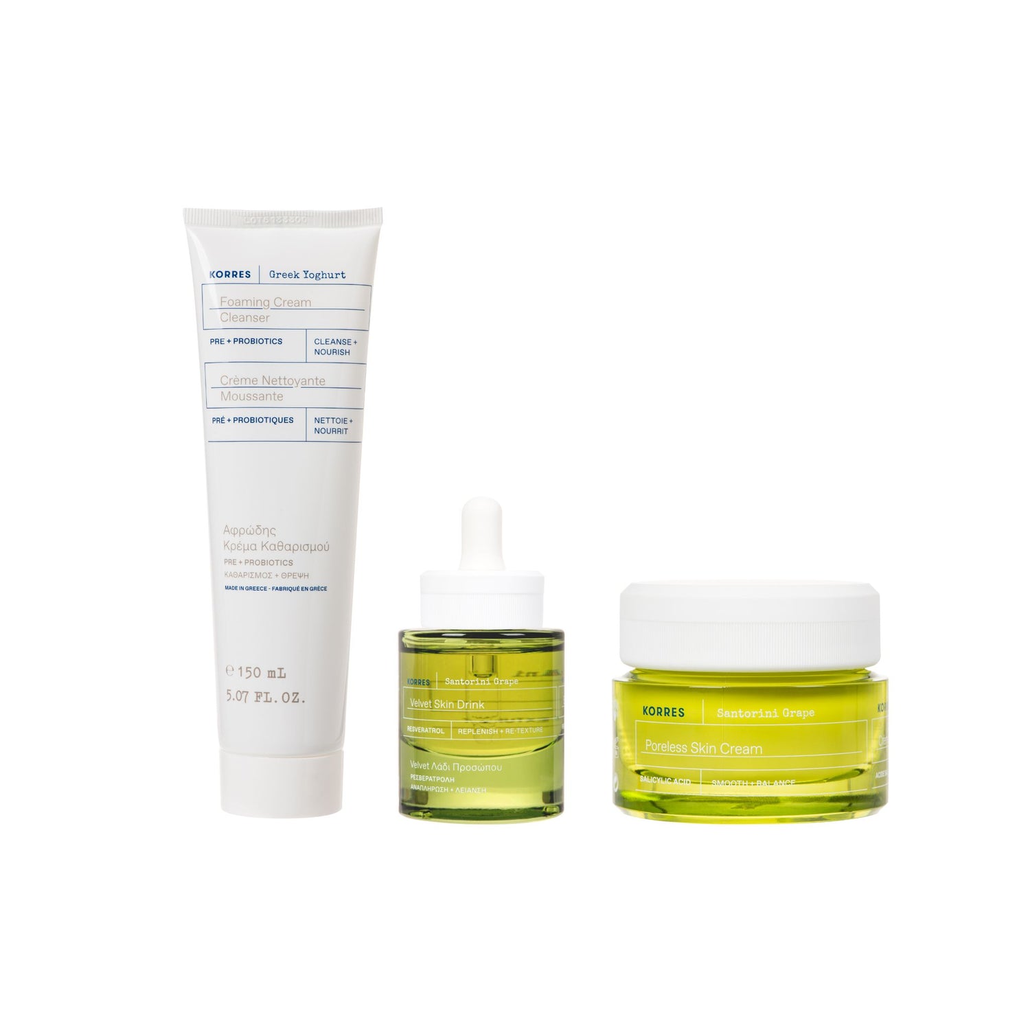 Das Greek Glow Signature Set vereint die Kraft griechischer Superfoods für sichtbar strahlende Haut. Griechischer Joghurt beruhigt und pflegt selbst empfindlichste Haut, während Santorini-Traube intensiv Feuchtigkeit spendet und für einen natürlichen Glow sorgt. Vom sanften Cleanser über das glättende Serum bis zur feuchtigkeitsspendenden Creme – dieses Set bringt deine Haut in Balance und lässt sie gesund und frisch erstrahlen.