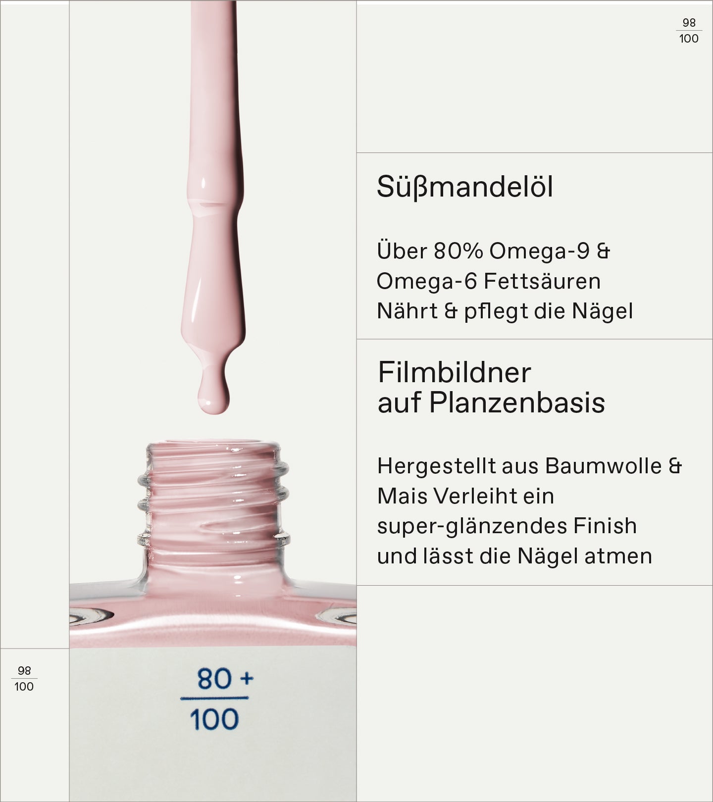 • Süßmandelöl – Über 80 % ω-9- und ω-6-Fettsäuren Pflegt und stärkt die Nägel